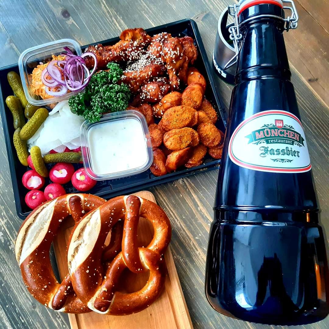 Weihenstephaner Weissbier vaadist 2L pudel (pandiga), vürtsikad BQ kanaõlad 10tk, Currywurst´i suupiste, Obazda, külm hapukoorekaste, Brezel 2tk, valge ja punane redis, kornišonid