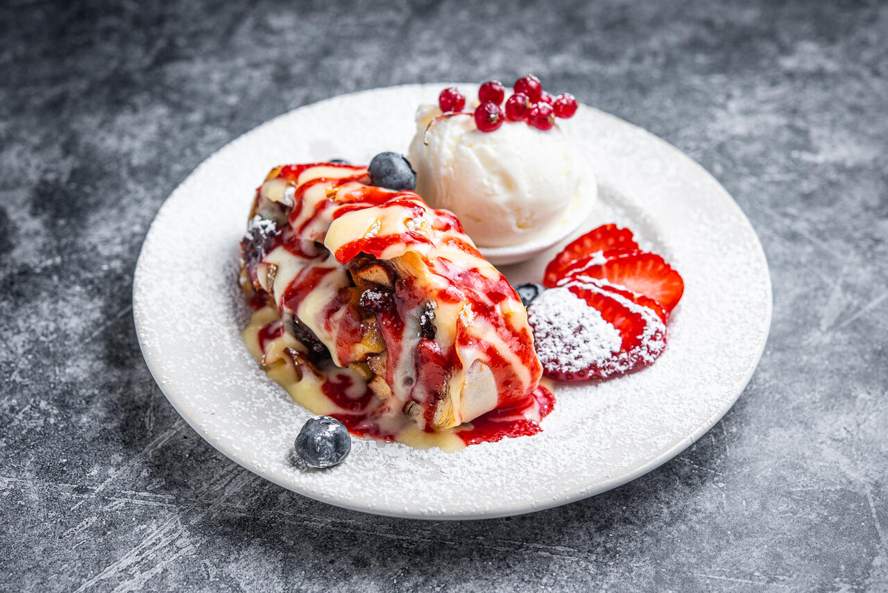 Apfelstrudel - ahjusoe õunastruudel vaniljekastme ja toormoosiga