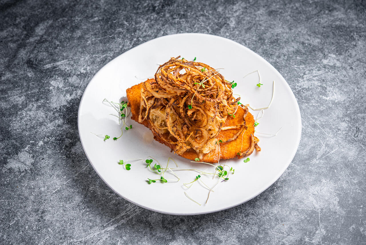 Šnitsel seaseljafileest praekapsa ja krõbeda sibulaga
