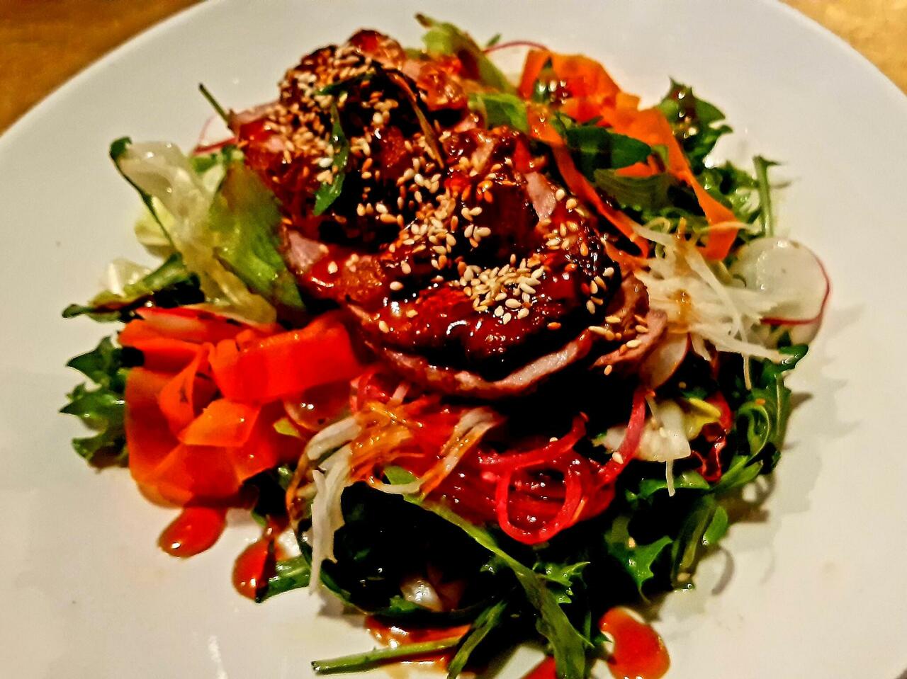 Kergelt suitsused röstitud pardifilee viilud värskel salatil Unagi kastmega