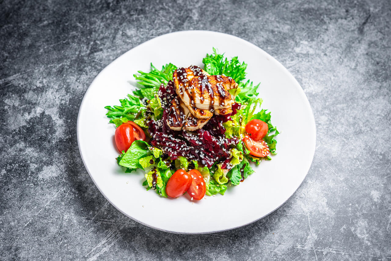 Suur salat BQ seakülje ja kiirmarinaadis puravikega