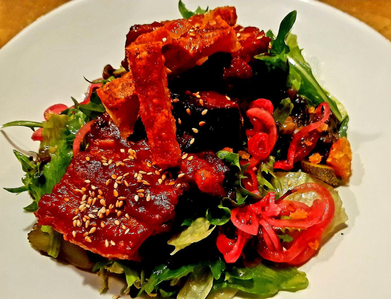 Hooajalise värskel salatil, mida on turgutatud saksapäraselt hapuka sinepikastmega, pikalt küpsetatud seakülje viilud ning kiirmarineeritud puravikud. Ja loomulikult saksapäraselt krõbedad seanaha lõigud. Paras ports. Eriti sobib dieeti pidavale meeshingele.