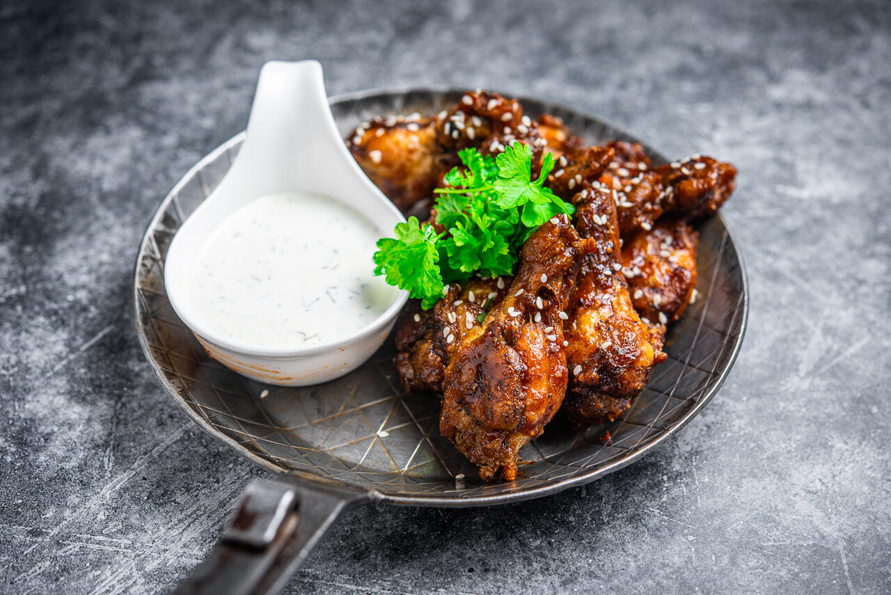 Heasti marineeritud ja pisut vürtsikad krõbedad BBQ kanatiivad, lisandiks külm hapukoorekaste.